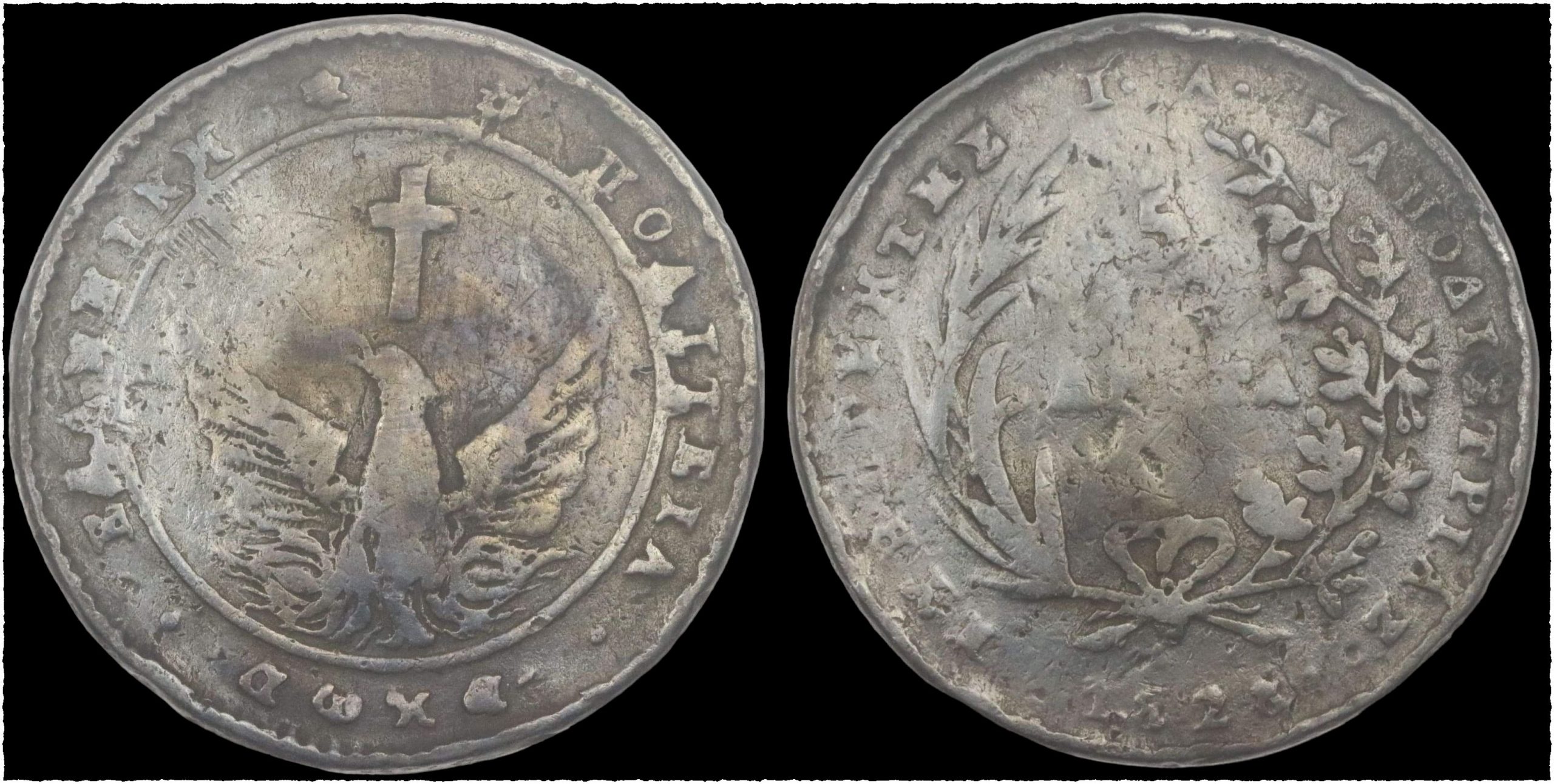 5 Lepta (1828) (type A.1) in copper with “Phoenix” with converging rays in solid circle. Variety “135-E.b” by Peter Chase.