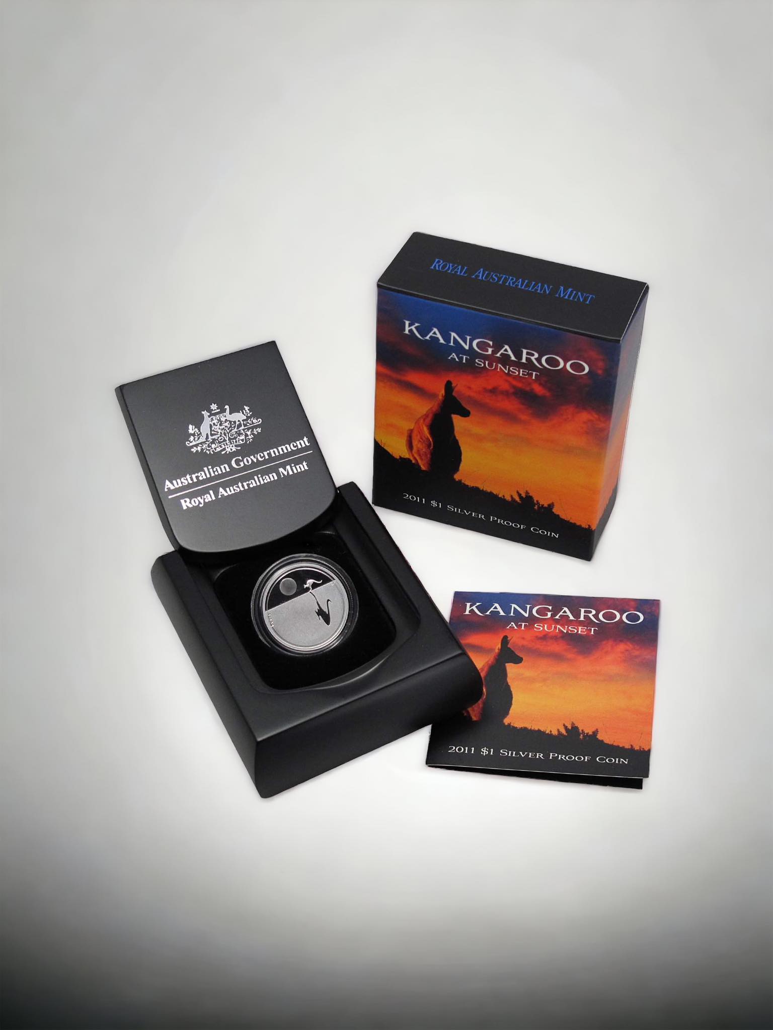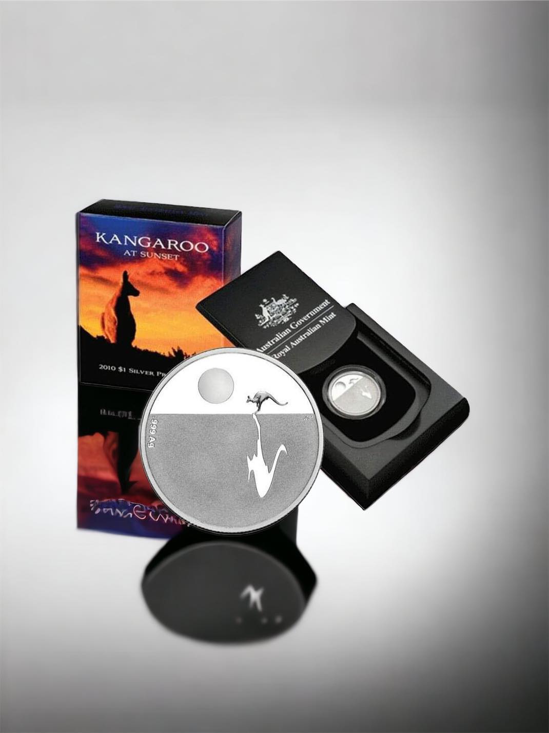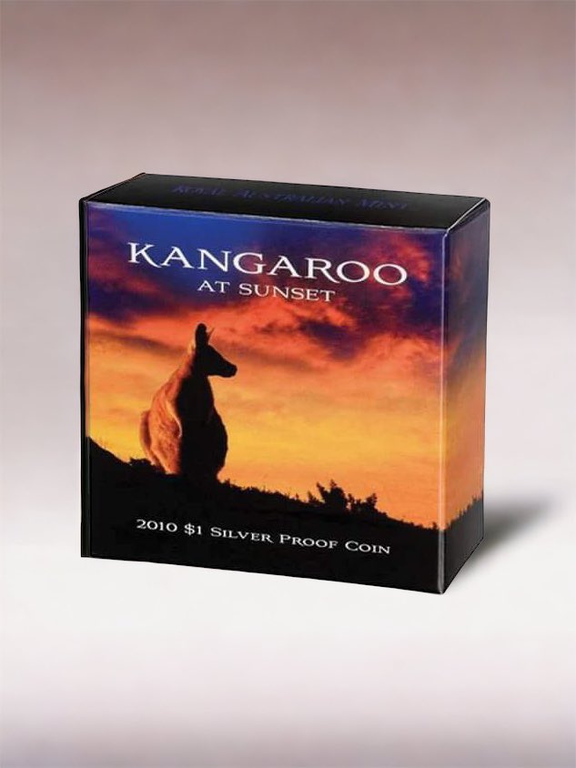 2010 Kangaroo at Sunset $1 Silver Proof Coin. The contemporary design of the Kangaroo at Sunset coin has made it one of the most sought after collector pieces from the Royal Australian Mint.