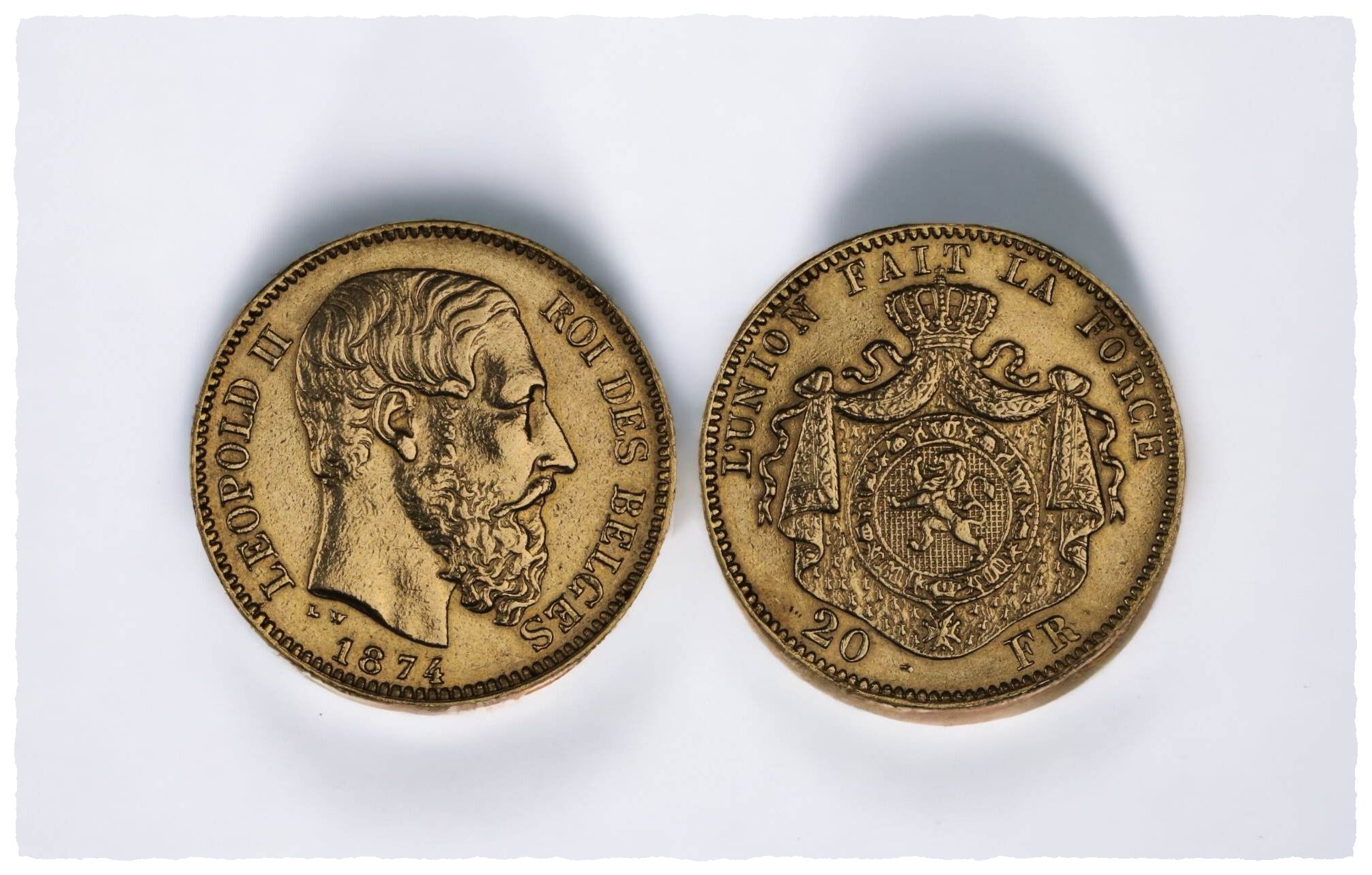 KM# 32, N# 13801; Heavy coarser beard; Gold (.900) 6.45 g., 21 mm.; Leopold II;