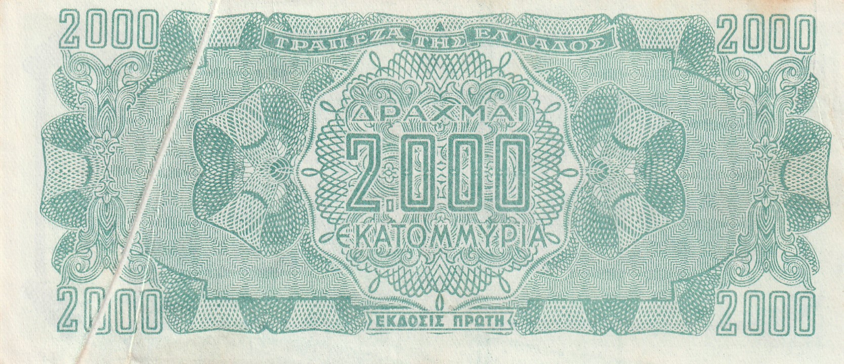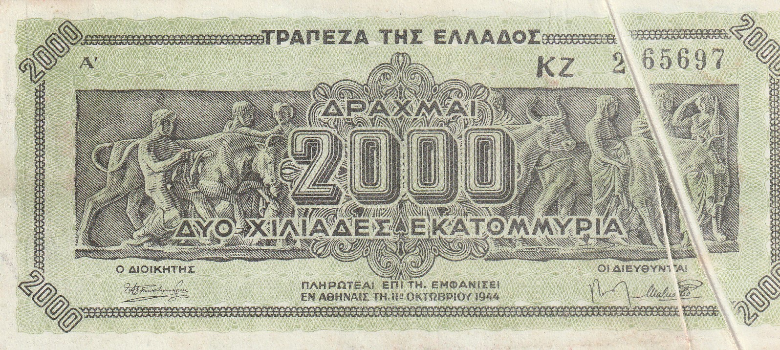 Translation: Bank of Greece, Drachme, Two Thousand Million, Payable on appearance in athens on October 11th, 1944