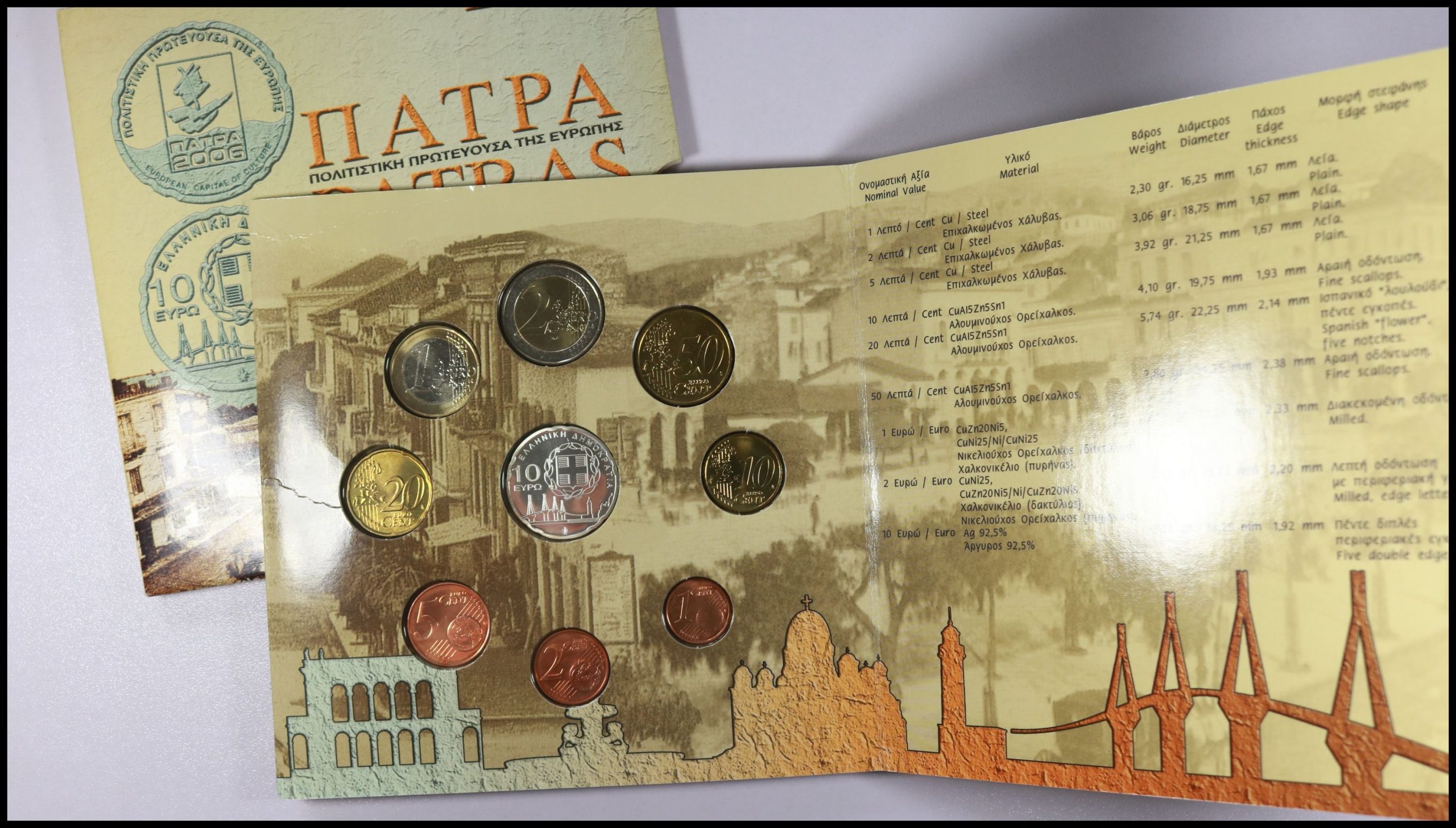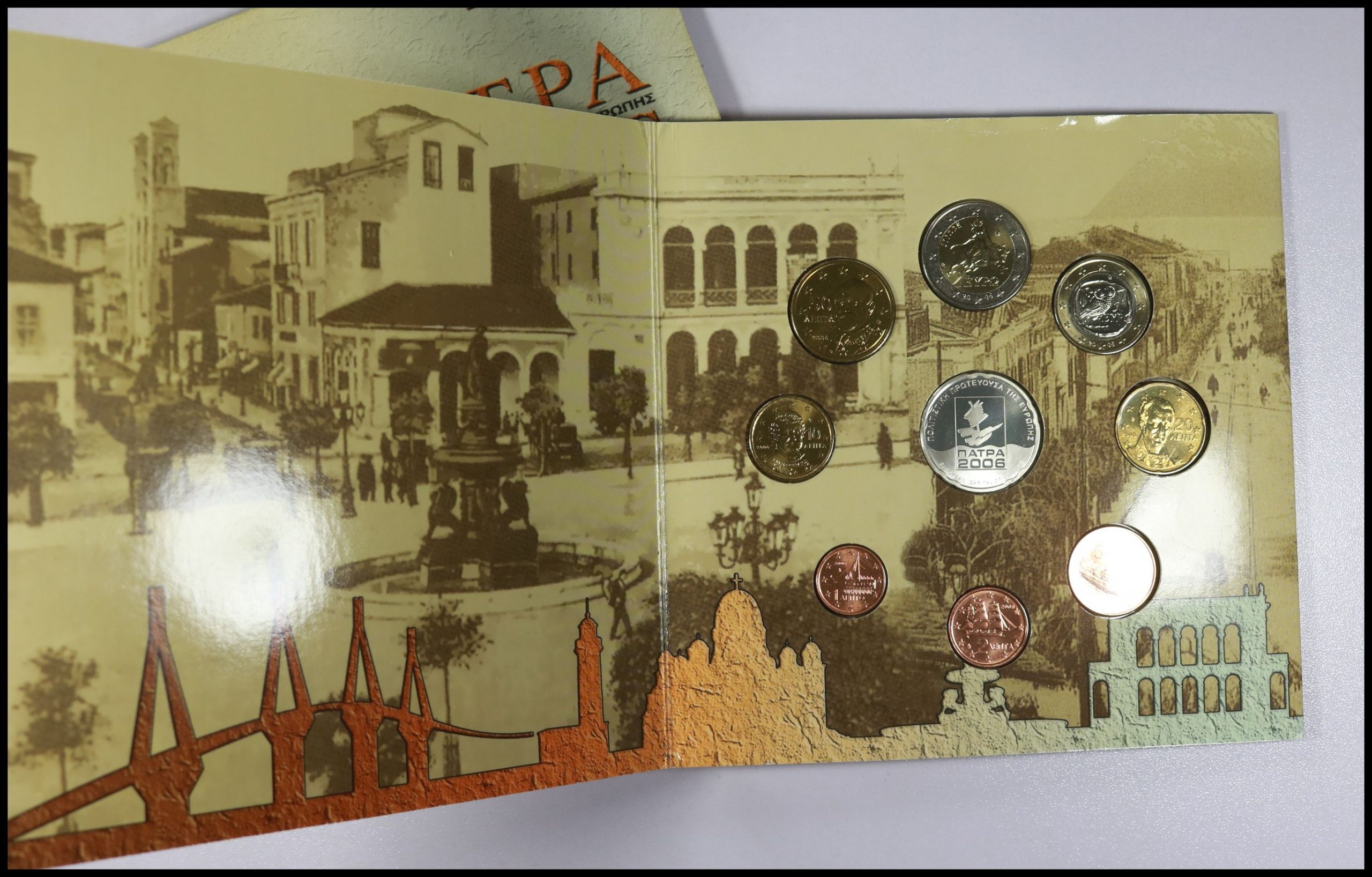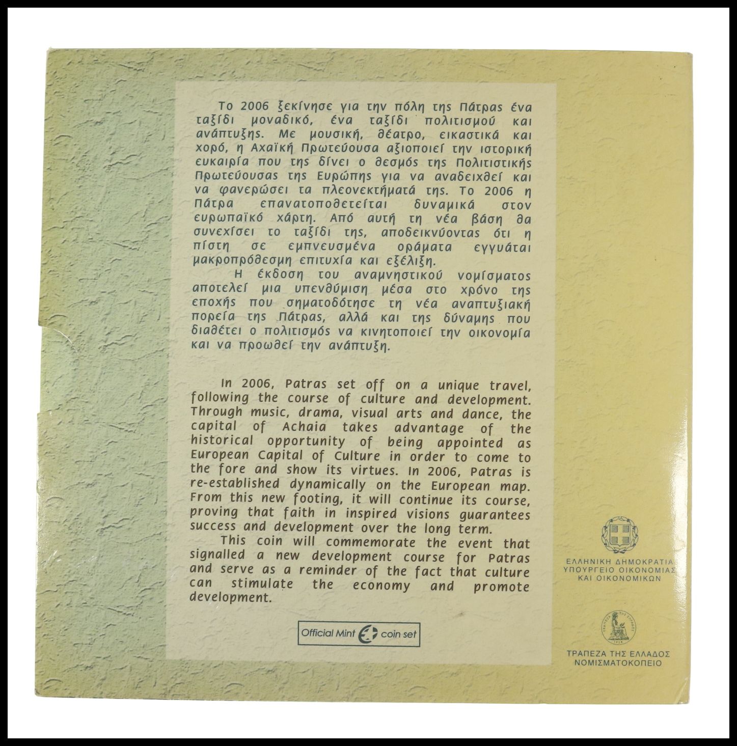 The Patra Blister 2006 was issued on 18 Spetember 2006 with a mintage of 25,000 pieces. It contains the 1, 2, 5, 10, 20, 50 cent coins and 1, 2 euros (unc), along with a silver 10 euros 2006 Patras Cultural Capital of Europe