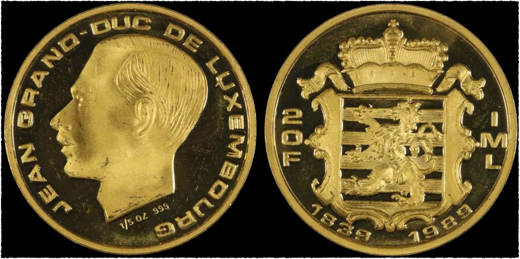 PROOF Luxemburg 20 Franc 1989, 999/1000 Gold